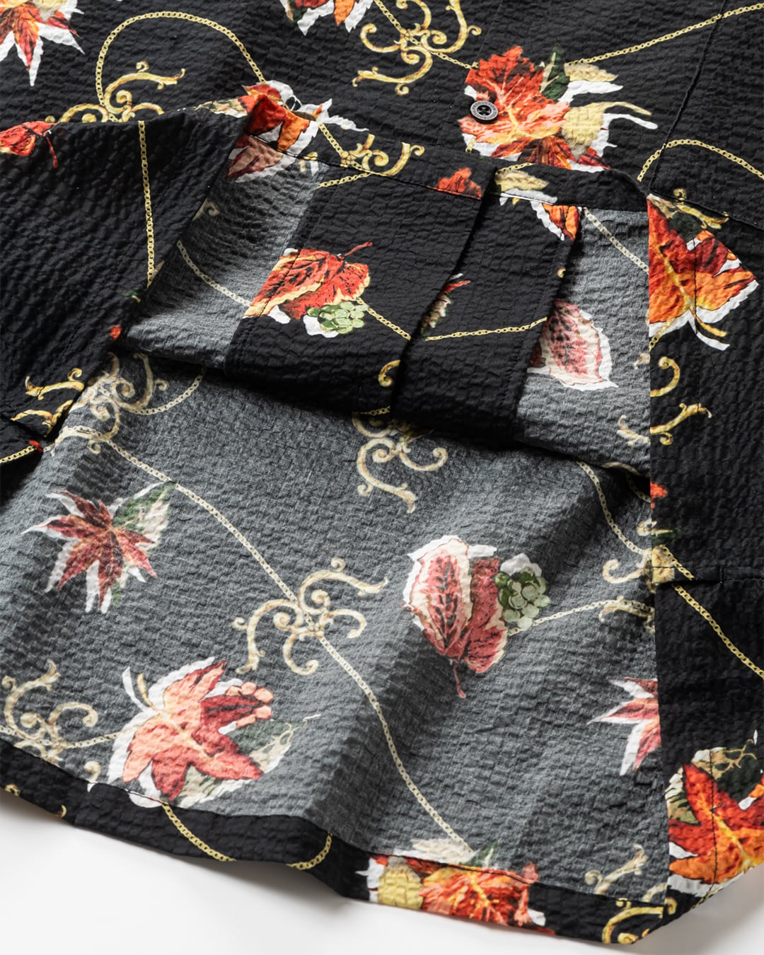 オリジナルの紅葉柄をインクジェットプリントした開襟シャツ。