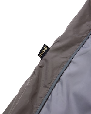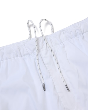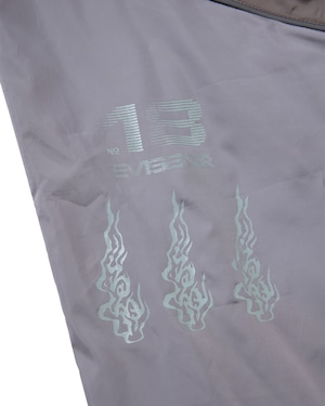 耐久撥水加工されたポリエステル素材のトラックパンツ。ヨコ糸に使われた極細のマイクロファイバーによって実現した、薄手ながらソフトな風合いが特徴です。全体にリフレクター素材のパイピングデザイン入り。ゴム入りのウエストには内出しの腰紐付き。左右の腰にはスラッシュポケット、後ろにはバックポケット搭載で、右のバックポケット上にはシルバーのゑ刺繍入り。右の腰ポケット下にEロゴ刺繍、バックの膝下にはOhakoグラフィックとEye Fireグラフィックのリフレクタープリント入り。左シームには黒地に金ロゴのネーム付きです。裾はドローコードでフィット感の調整が可能。裏地には通気性の良いメッシュ生地を使用。刺繍や